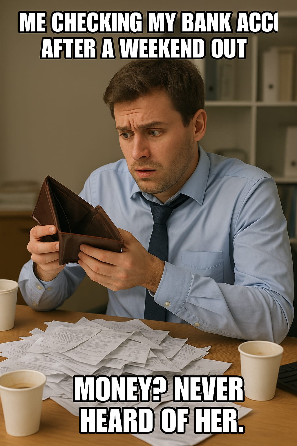 Here's a viral-ready meme guaranteed to tickle those funny bones and get maximum social media shares! Picture a photorealistic stressed-out office worker staring wide-eyed at his EMPTY WALLET amidst a chaotic mess of bills and coffee cups. The top bold white text with a black outline screams, "ME CHECKING MY BANK ACCOUNT AFTER A WEEKEND OUT," while the bottom delivers the classic punchline: "MONEY? NEVER HEARD OF HER." This meme oozes relatability, humor, and that pinch-me-I’m-broke vibe, perfect for anyone who's ever experienced the post-fun financial facepalm. Keywords: money meme, broke humor, empty wallet, relatable finance meme, weekend spending, funny viral, social media meme.